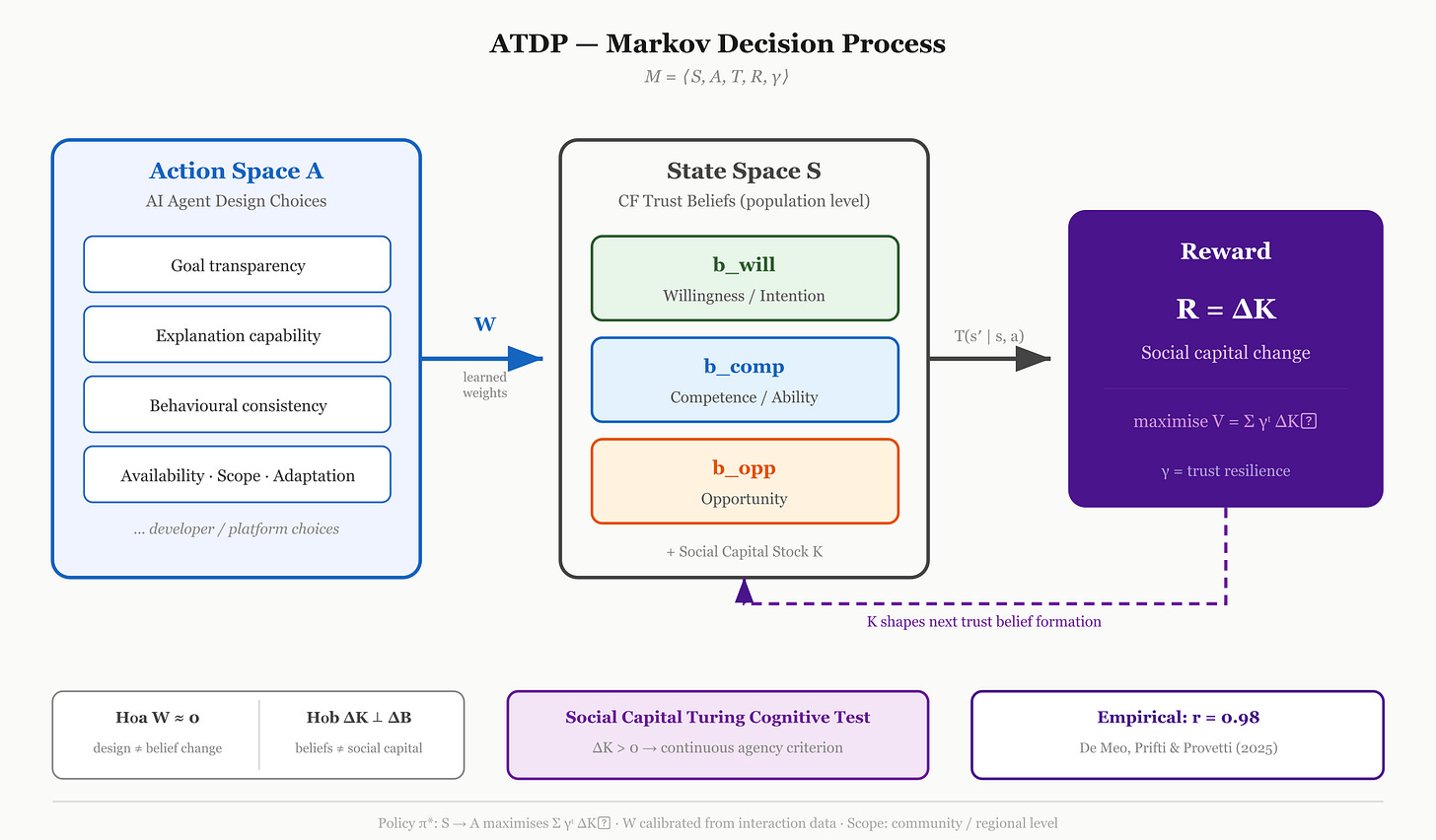 In earlier work, I proposed a framework—Agentic Trust Design for Positive Social Capital (ATDP) [12] — that inverts this direction. Instead of building an agent and then asking “is it trustworthy?”, we treat agent design as a deliberate decision variable within a formal system.