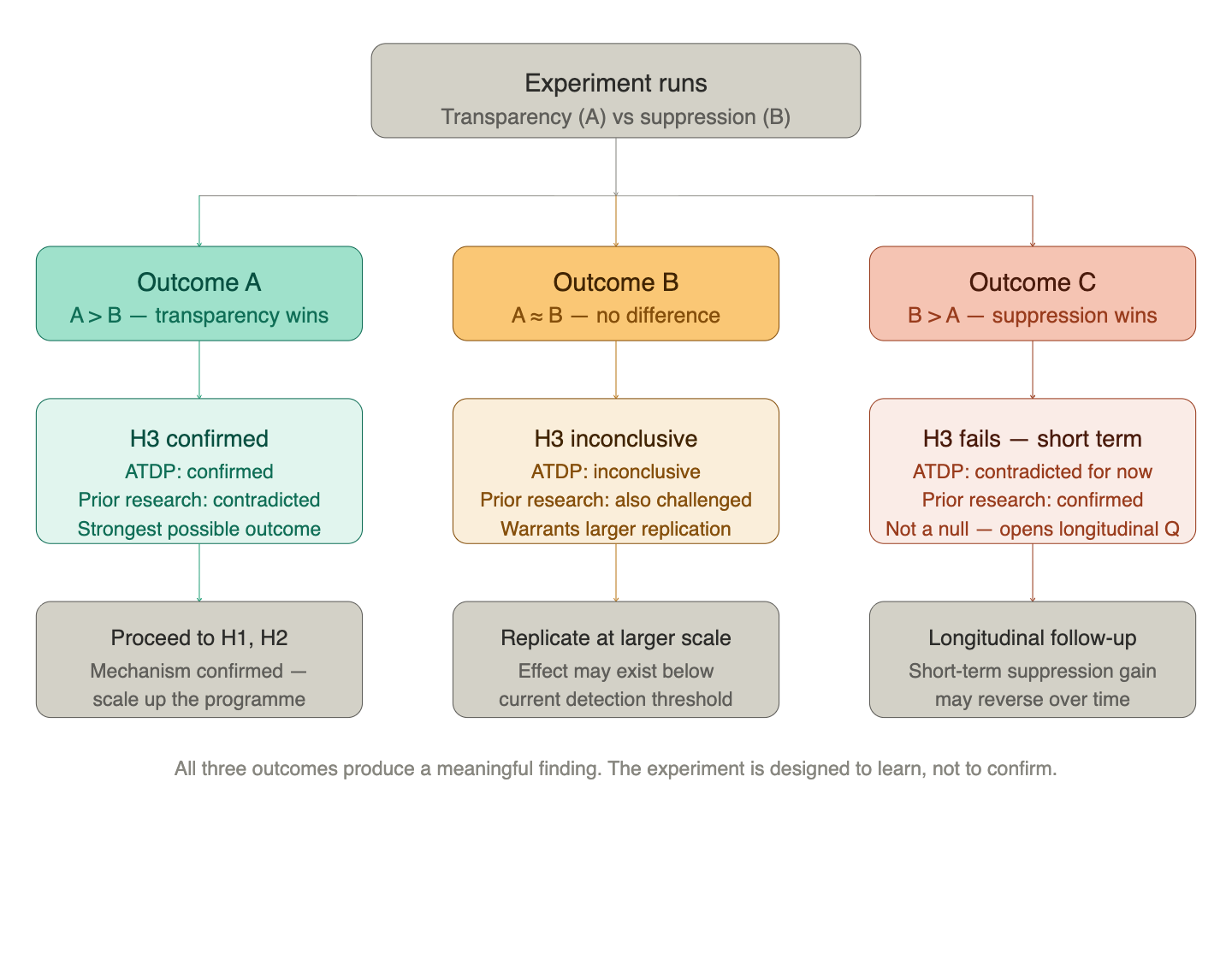 If Prediction 3 fails — if transparency of failure does not produce a measurable trust difference — then the weight matrix W at the core of the ATDP formulation is closer to zero than the framework requires, and the entire programme needs to reassess its foundational assumption. That is why we start here. Confirmation of Prediction 3 is the licence to proceed to the more complex tests. Failure of Prediction 3 is the most informative result the programme could produce at this stage.