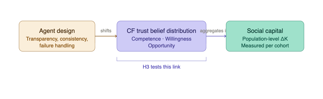 The causal chain the framework proposes runs from agent design properties, through trust belief distributions, to social capital change. Before testing whether trust belief shifts propagate into social capital — which is what Predictions 1, 2, 4, and 5 ultimately require — we need to confirm that agent design properties shift trust beliefs at all. That is the mechanism test. Without it, the rest of the causal chain is untethered.