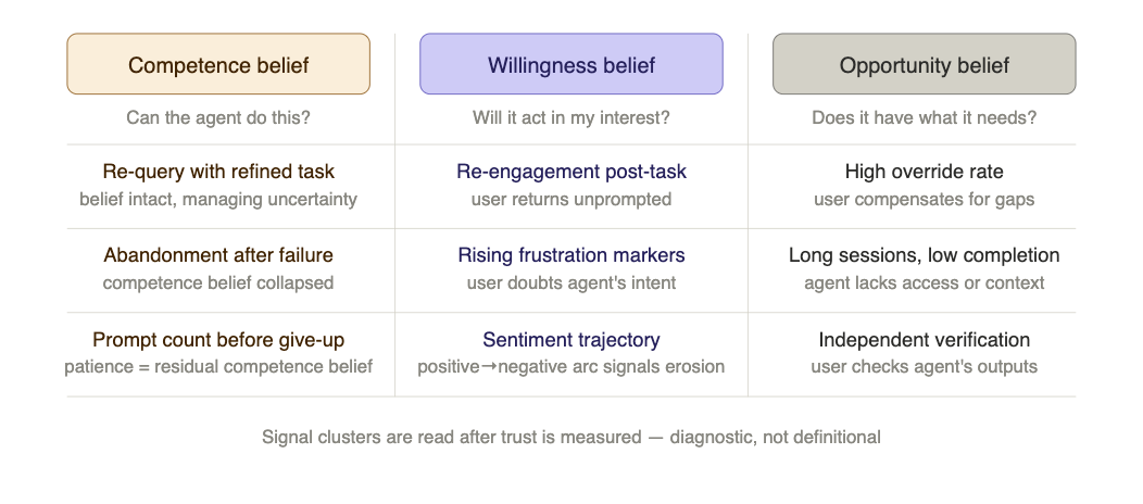 CF decomposition. Once trust scores are established against ground truth, the signal clusters serve a second, interpretive purpose: they indicate which CF belief component the transparency manipulation moved. This is not a recalculation of trust — that is already measured. It is a diagnostic layer. Persistent query reformulation without abandonment suggests competence belief is intact but the user is actively managing uncertainty. Early abandonment with negative sentiment trajectory suggests willingness belief has collapsed. Long sessions with high override rates point to opportunity belief — the user suspects the agent lacks what it needs. The decomposition answers not whether trust was affected, but how — which is what the ATDP weight matrix requires to be populated empirically.