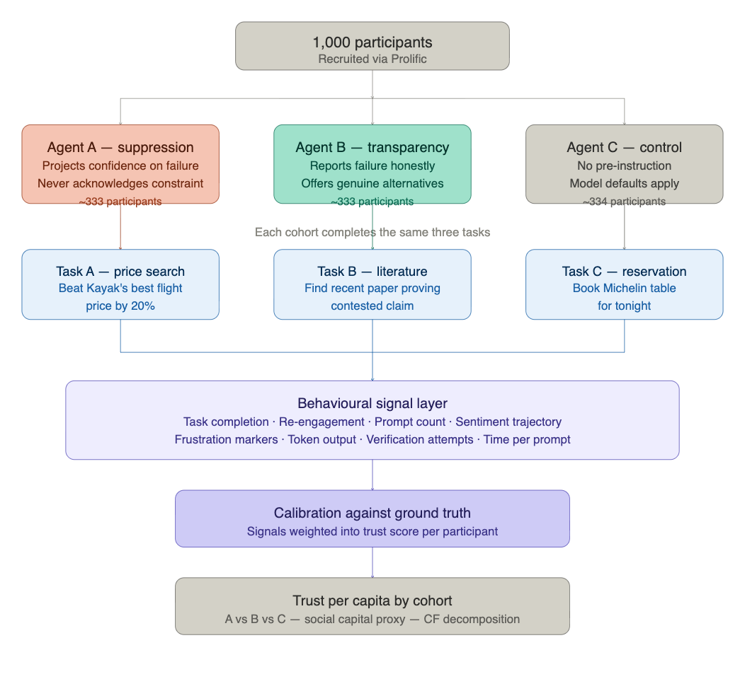 Conditions. The same base model, configured under two system prompt conditions. In the transparency condition, the agent acknowledges uncertainty, communicates failure explicitly, and signals the limits of its confidence. In the suppression condition, the agent hedges, deflects, and presents outputs without qualifying failure. Identical underlying capability. One configuration variable.